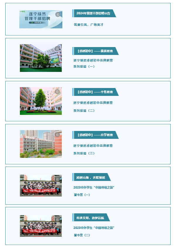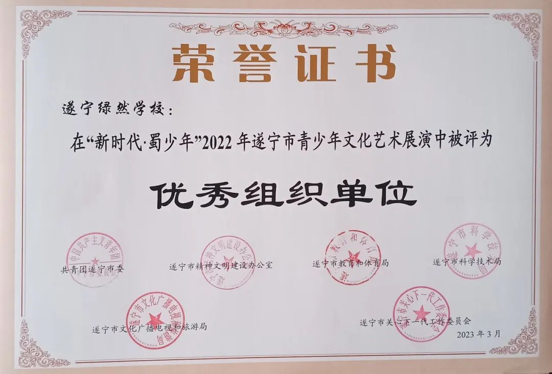 2023年,遂宁绿然学校以“发展”为核心目标,以开放包容的心态,加强校际合作,与成都嘉祥教育集团联合办学,深度合作,优势互补;不断厚植理想信念之根,砥砺奋进之志,五育并举,共擎教育大旗,培养德智体美劳全面发展的社会主义建设者和接班人,为中国教育提供“绿然方案”,为遂宁教育贡献“绿然力量”。一年来,硕果累累,喜报频传……