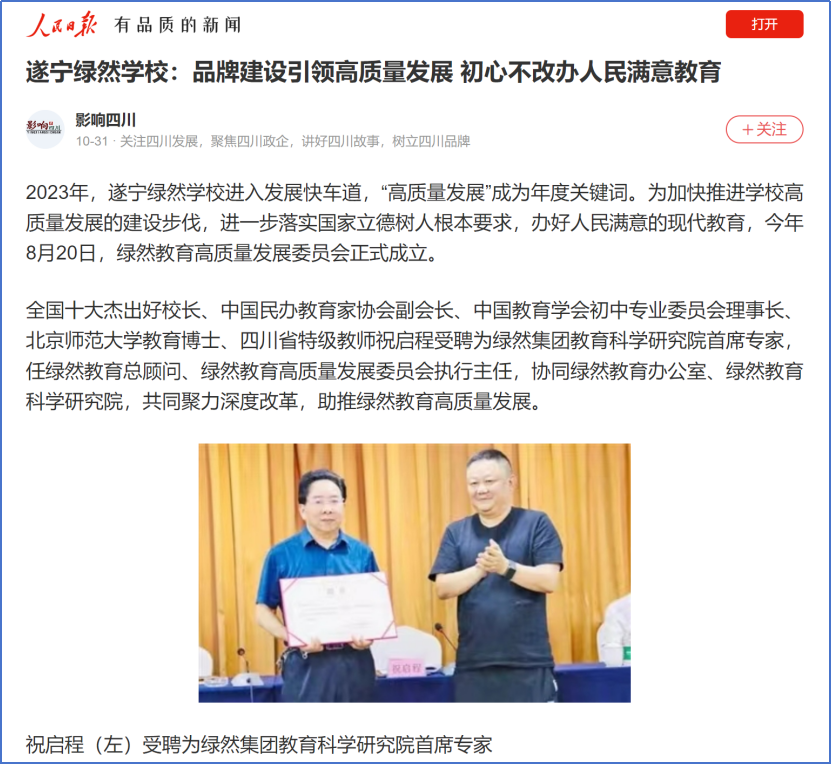 2023年,绿然教育高质量发展委员会正式成立,全国十大杰出好校长、中国民办教育家协会副会长、中国教育学会初中专业委员会理事长、四川民办中小学专业委员会理事长、四川省教育厅咨询专家、四川师范大学特聘教授、北京师范大学教育博士、四川省特级教师祝启程先生受聘为绿然集团教育科学研究院首席专家,任绿然教育总顾问,担任绿然教育高质量发展委员会执行主任。协同绿然教育办公室、绿然教育科学研究院,共同聚力深度改革,助推绿然教育高质量发展。